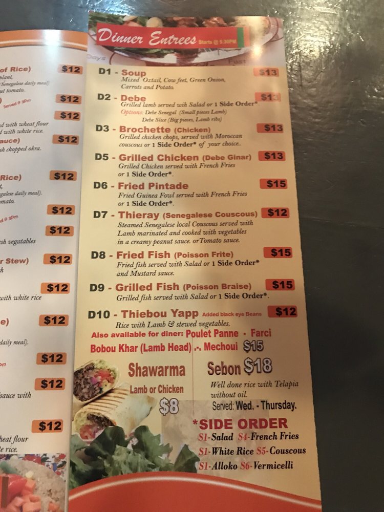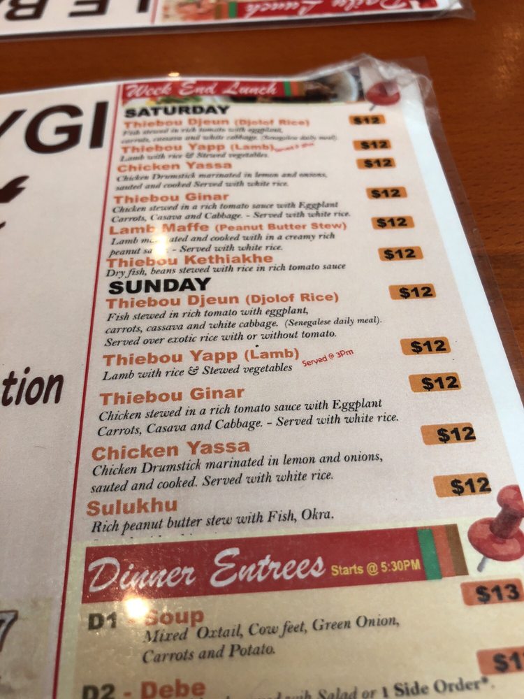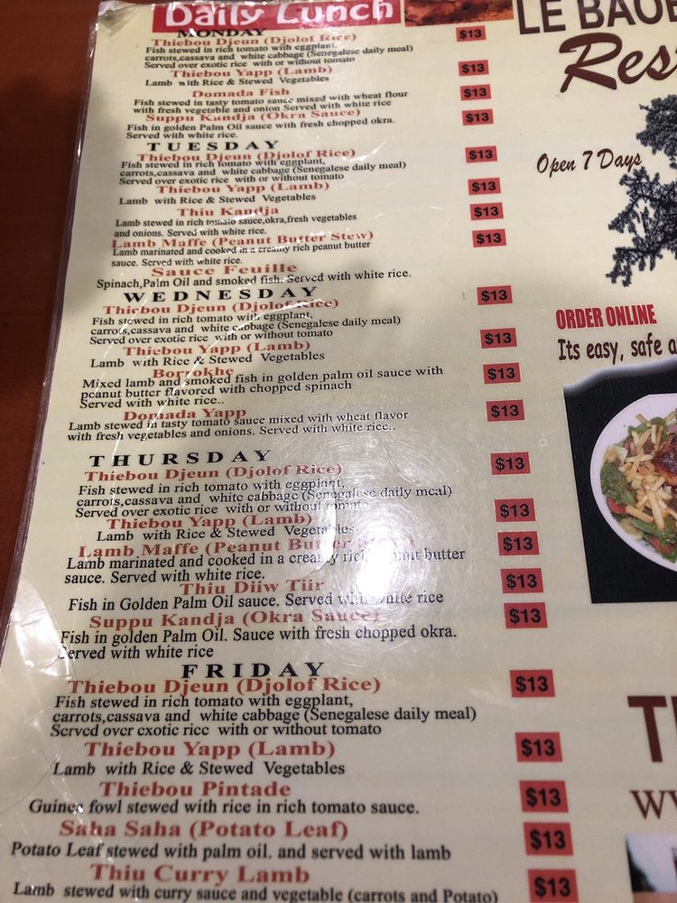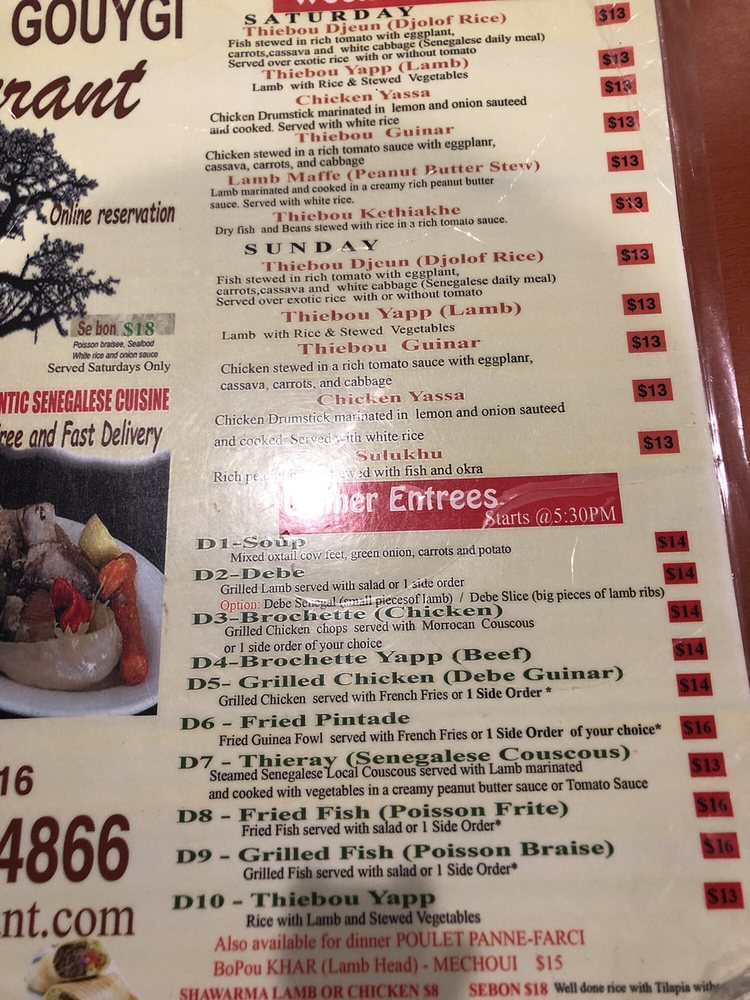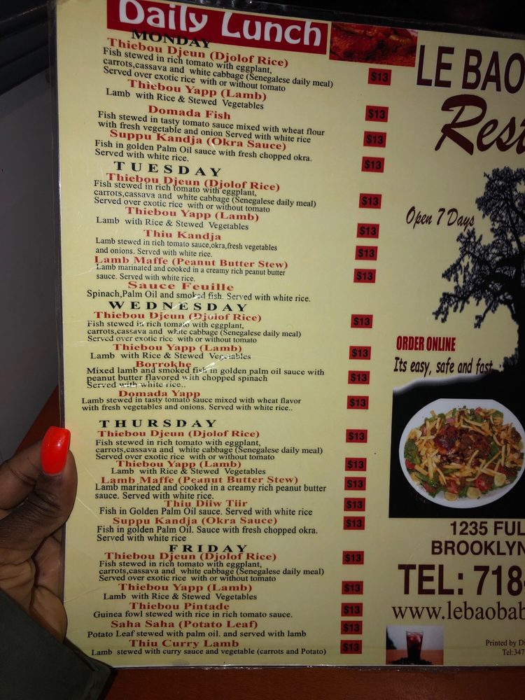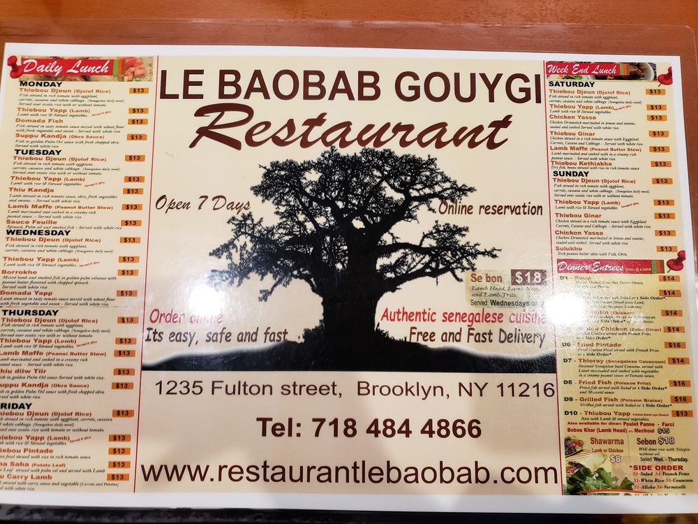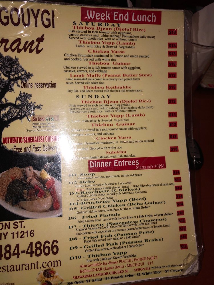 Le Baobab Gouygui 2 is a hidden gem located in Brooklyn, NY, offering a fusion of authentic Senegalese dishes with a cozy ambiance. The menu boasts traditional favorites like Thiebou Djeun Djolof rice, Thiebou Yaap Lamb, and Borrokhe Miked Lamb, each bursting with rich flavors and hearty portions. Guests rave about the Chicken Yassa, a tangy marinated chicken dish, and the national favorite Thiebou Djen, a tomato-based fish and rice medley. The house specials like the Macaroni Special Pasta are must-tries. Le Baobab Gouygui 2 prides itself on delivering quick service and generous portions, making it a top choice for West African dining. Don't miss out on their unique homemade drinks, adding a refreshing touch to your meal. With a diverse menu and affordable prices, this spot is a must-visit for food enthusiasts seeking a taste of Senegal in Brooklyn.